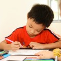 小男生聚精会神的给图画上色,好样的!