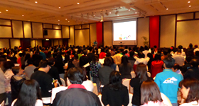 ![]() 开幕礼再度唱起《恩泽是我家》,愿爱充满营会。 |